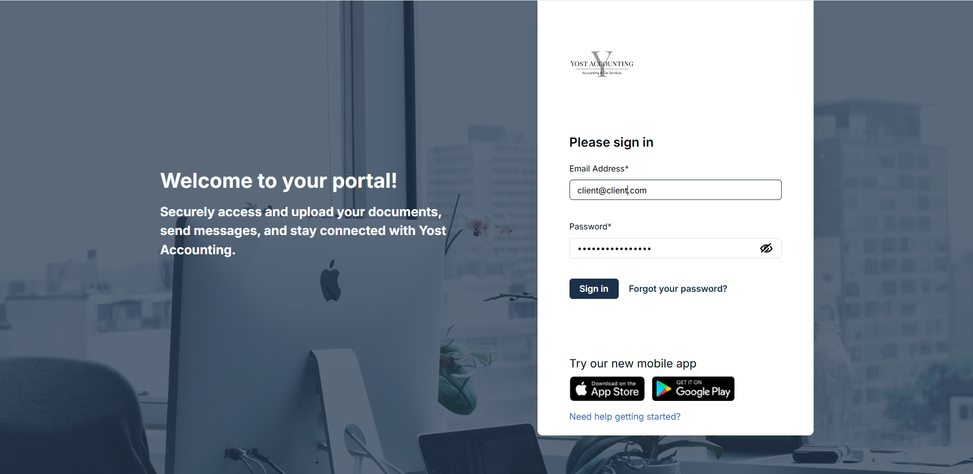 Securely access and upload your documents, send messages, and stay connected with Yost Accounting, all in our easy-to-use portal.